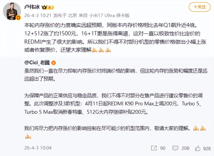 同日,a8体育官方网站小米中国区商场部总司理魏想琪也在个东谈主微博发文称,这次调理波及3款机型:4月11日起REDMI K90 Pro Max上调200元,Turbo 5、Turbo 5 Max取消新春特惠、512G大内存赓续补贴200元。
