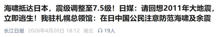 长江日报《海啸抵达日本,震级调度至7.5级!日媒:请追想2011年地面震,立即逃生!我驻札幌总领馆:在日中国公民宝贵防护海啸及余震》