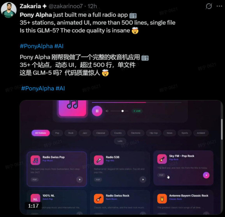 有东说念主用一句话辅导词,让它生成了一个包含35个大众电台的收音机网页愚弄,动画UI畅达,代码跨越500行,沿路塞在一个文献里。