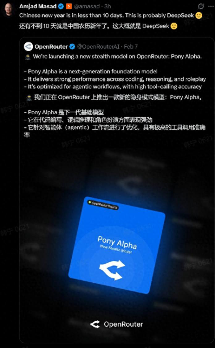 OpenRouter官方发了一条推文,口吻云淡风轻:"咱们上线了一个新的隐身模子:Pony Alpha。
