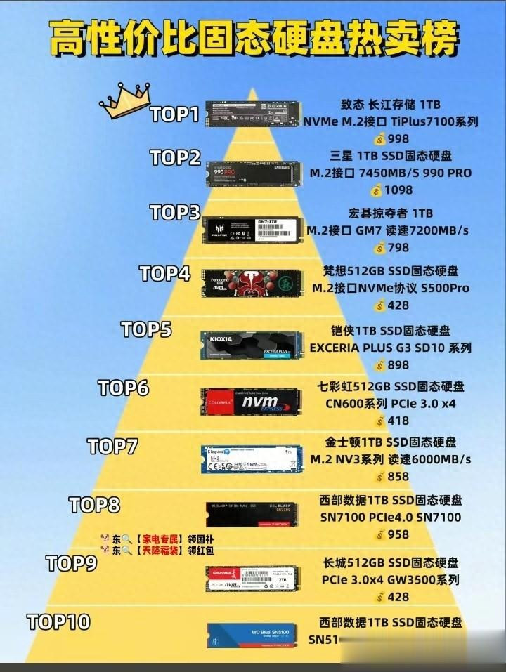 2026年4月3日,一份最新的高性价比固态硬盘热卖榜激励行业暖和,致态长江存储1TB NVMe M.2接口TiPlus7100系列以998元的价钱登顶榜首,三星990 PRO、宏碁褫夺者GM7等家具紧随后来。这份榜单不仅反馈了现时存储市集的价钱与性能方法,更折射放洋产存储品牌在技能突破与市集认同度上的显耀提高,记号着固态硬盘认真进入“性能普惠”时期。
