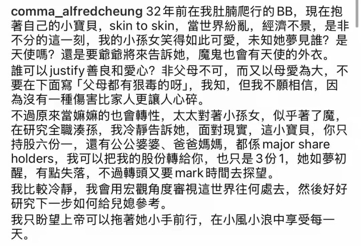 跟着大女儿为张家喜添令嫒,张坚庭又迎来喜事一桩,并在动态中唏嘘惊奇,32年前还在他肚腩上爬行的孩子,刻下如故有我方的孩子了。