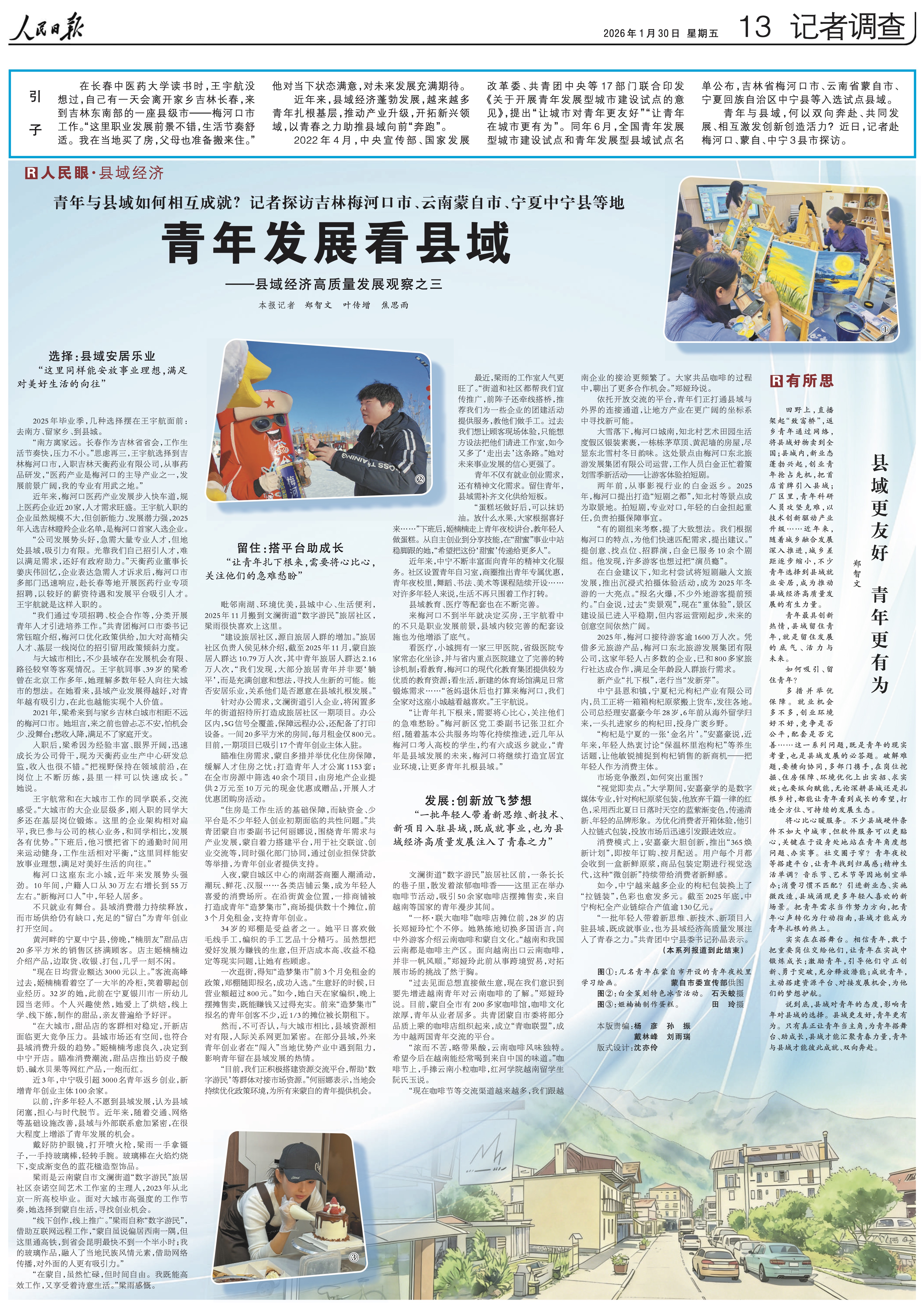 后生与县域,何故双向奔赴、共同发展、相互引发立异创造活力?近日,记者赴梅河口、蒙自、中宁3县市走访。