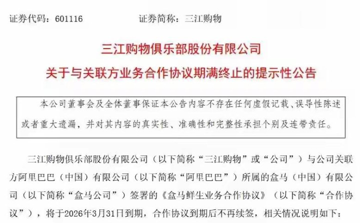 早在2025年4月,阿里就开启了减持款式,中间8月又来了一波,加起来不到一年工夫,阿里从三江购物这儿一共回笼了约3.64亿元资金。手里的股份也从当初的32%沿途降到了当今的27%。最耐东说念主寻味的是,三江购物和盒马的和谐条约也行将在2026年3月31日到期,何况明确说了“不再续签”。