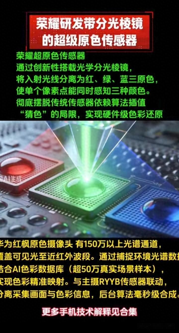 2026年4月1日,荣耀首席影像工程师罗巍郑重晓谕,荣耀搭载分光棱镜的“超等原色传感器”研发得胜,这项本领将透澈蜕变影像行业的形貌。该本领通过立异性搭载光学分光棱镜,将入射光辉分裂为红、绿、蓝三原色,使单个像素点能同期感知三种豪情,透澈开脱传统传感器依赖算法插值“猜色”的局限,已矣硬件级色调复原。这一龙套象征入辖下手机影像从“计议影相”时期郑重迈入“光学影相”时期,为行业建造了新的本领标杆。