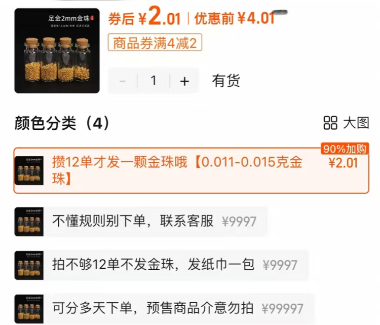 在短视频平台的某黄金直播间里,主播正在倾销0.01克重的小金珠,1粒价钱为24.9元,2粒价钱为49.8元,除新客不错有6元减免外,并莫得存在多买更低廉的情况。但10元运脚果然会令东说念主感到“只买一粒不合算”。