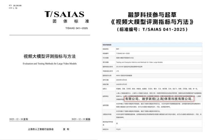同期,由上海市东谈主工智能行业协会发布的《视频大模子评测主见与法子》(圭臬编号:T/SAIAS041-2025),融梦科技亦深度参与了其工夫推敲与编制就业。公司将在AI体育鸿沟积存的工夫瞻念察与工程教授融入圭臬,有劲保险了评测体系的科学性与实用价值,为该鸿沟的法度化发展提供了弱点依据。